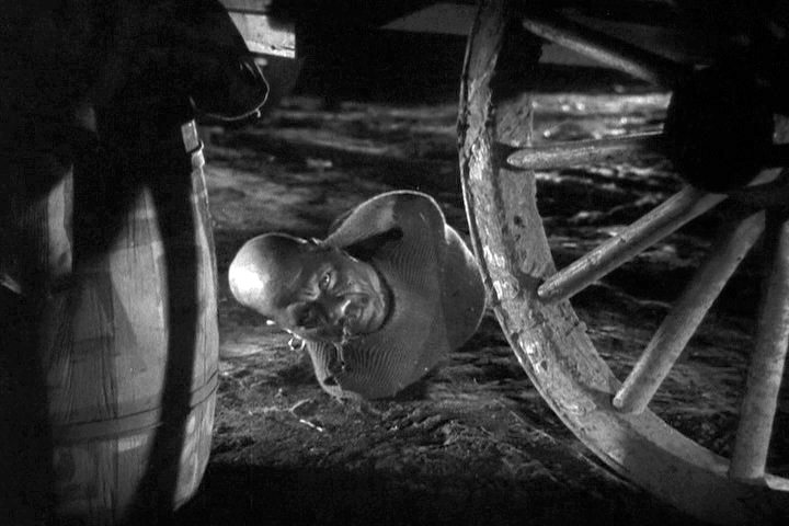 Randian can also be seen in the climactic scene in the rain, crawling on his stomach underneath one of the caravans, knife held between his teeth.